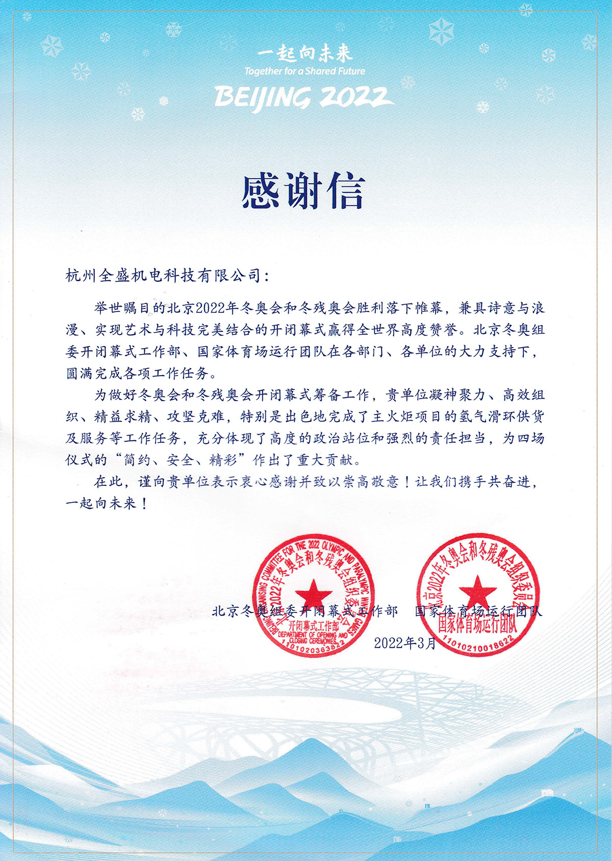 我司收到2022年冬奧會和冬殘奧會組織委員會感謝信!